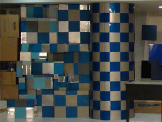 集めた段ボールを組み立てそれに切った紙をはりつけ形作っています。