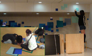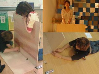 集めた段ボールを組み立てそれに切った紙をはりつけ形作っています。