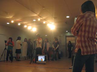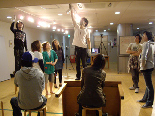 天井のスポットライトを遠くから(出演者に)当てて、まぶしさが半減できるかを試したり、